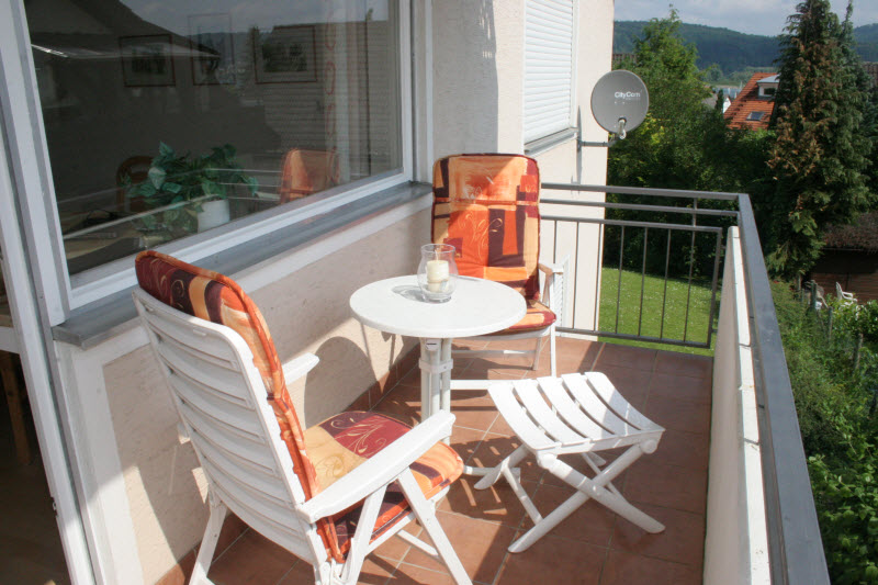 Der Balkon grenzt unmittelbar am Wohnzimmer an und bietet die Möglichkeit z.B. morgens in der Sonne zu frühstücken oder am Nachmittag diesen Schattenplatz zum Lesen zu nutzen. Die Einrichtung ist