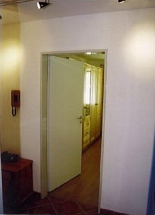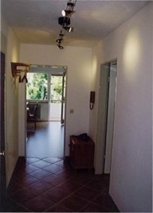 Vom zentralen Flur haben Sie Zugang zu allen Räumen. Die Ausleuchtung erfolgt über moderne Strahler. Der Boden ist freundlich und farblich warm gefliest.
