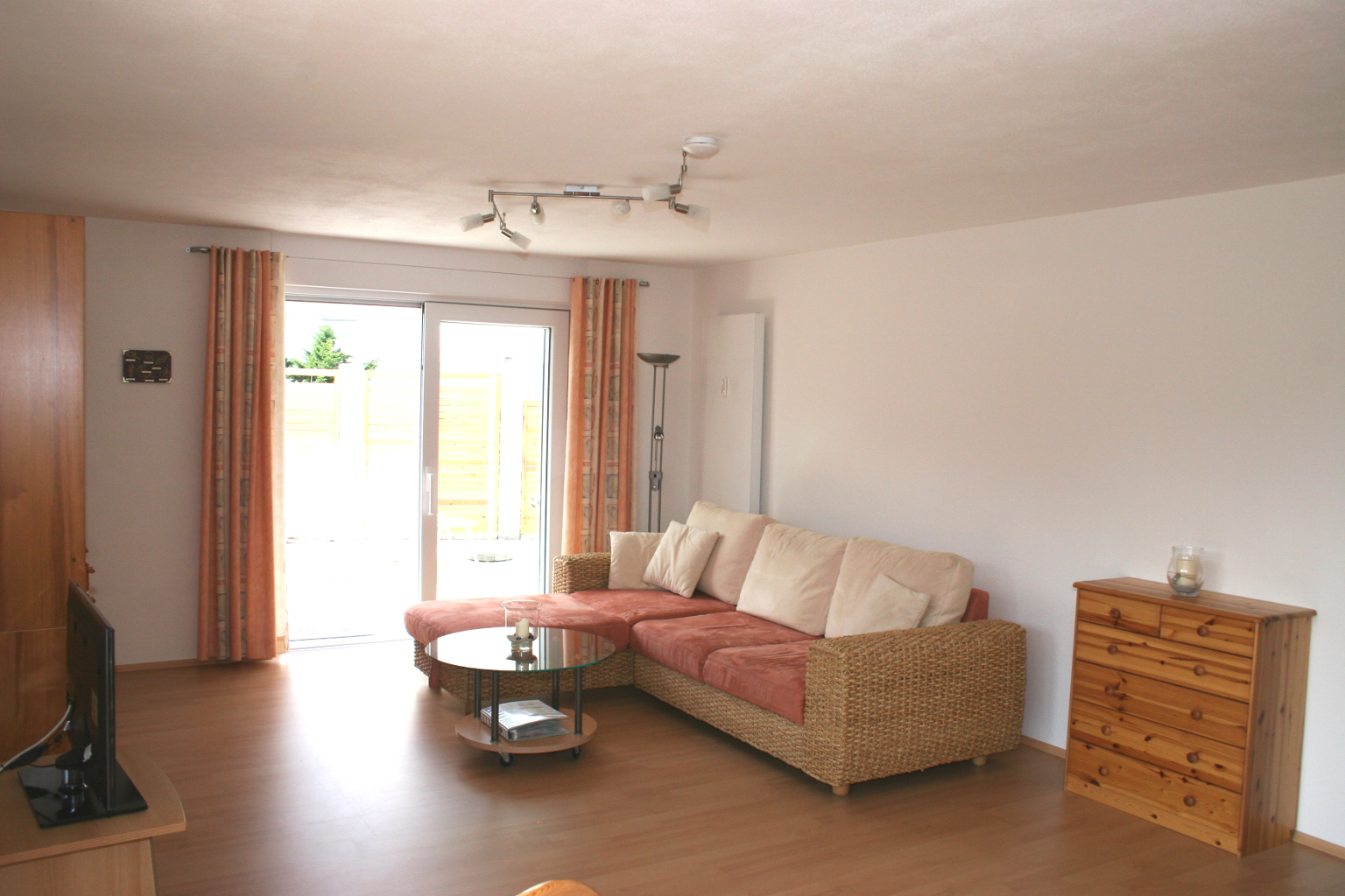 Das Wohnzimmer ist der zentrale Raum der Ferienwohnung. Man hat von hieraus Zugang zum Balkon oder über eine Schiebetüre zur Sonnenterrasse (50 qm). Eine Schlafcouch bietet ausreichend Platz für 2 erwachsene Personen oder Kinder in nahezu jedem Alter. Die Ausstattung ist wie folgt: